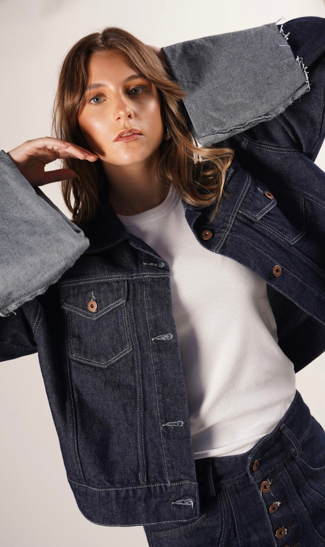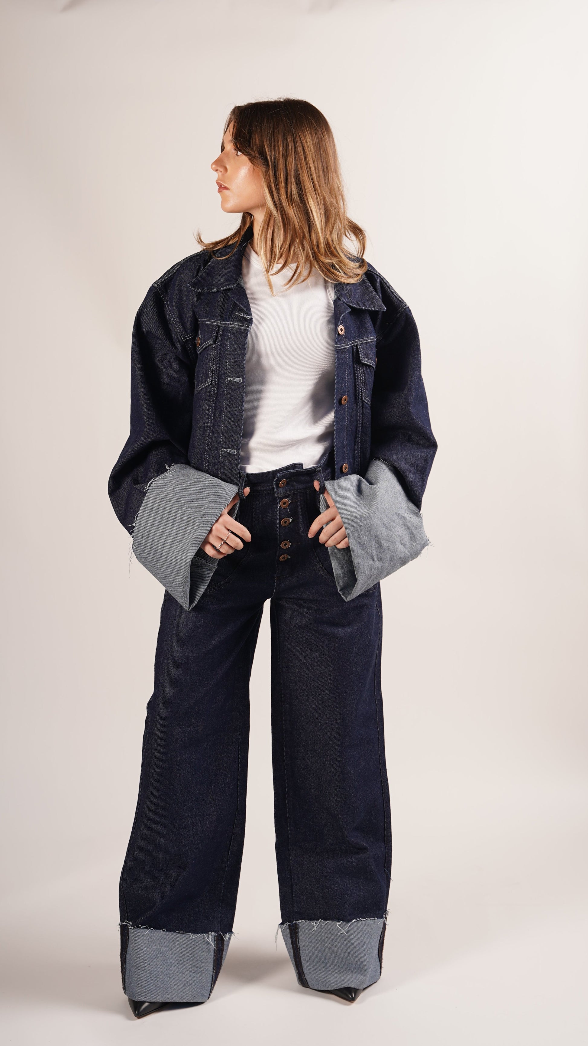 The 1982 Jacket is a classic with a twist, inspired by timeless fashion. Its deep indigo color contrasts with the distressed details on the cuffs, giving it a unique and bold character. Its oversized cut and wide sleeves add a dose of modernity, making it an #EverydayJacket