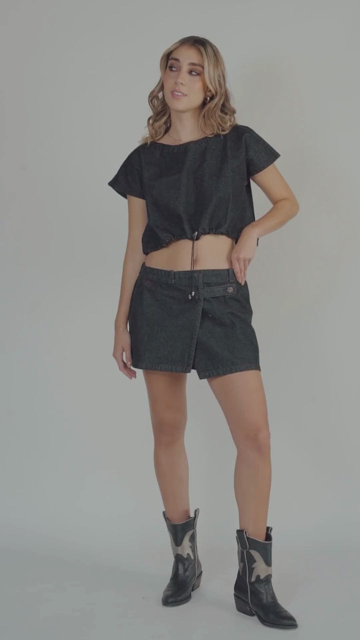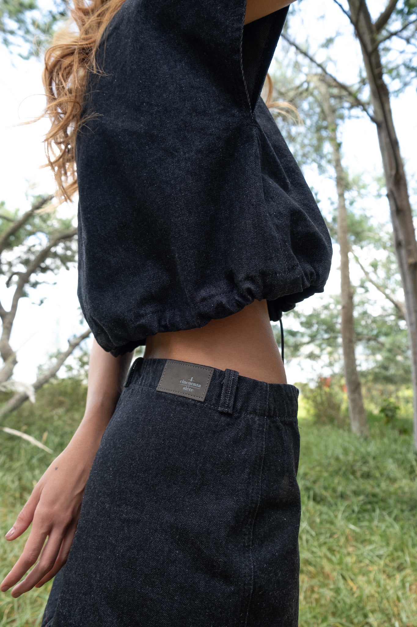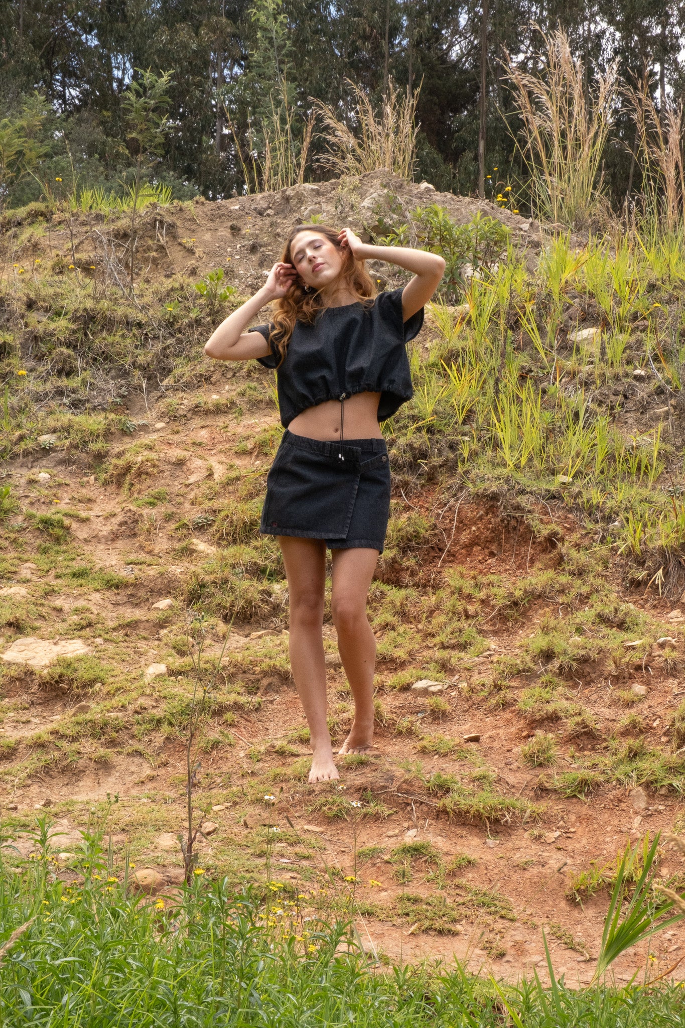 This black crop top, made from 100% organic cotton denim, is the definition of relaxed versatility. Its loose fit and fitted waist allow you to play with your silhouette, while the raw texture details reflect +57's urban and sustainable spirit.