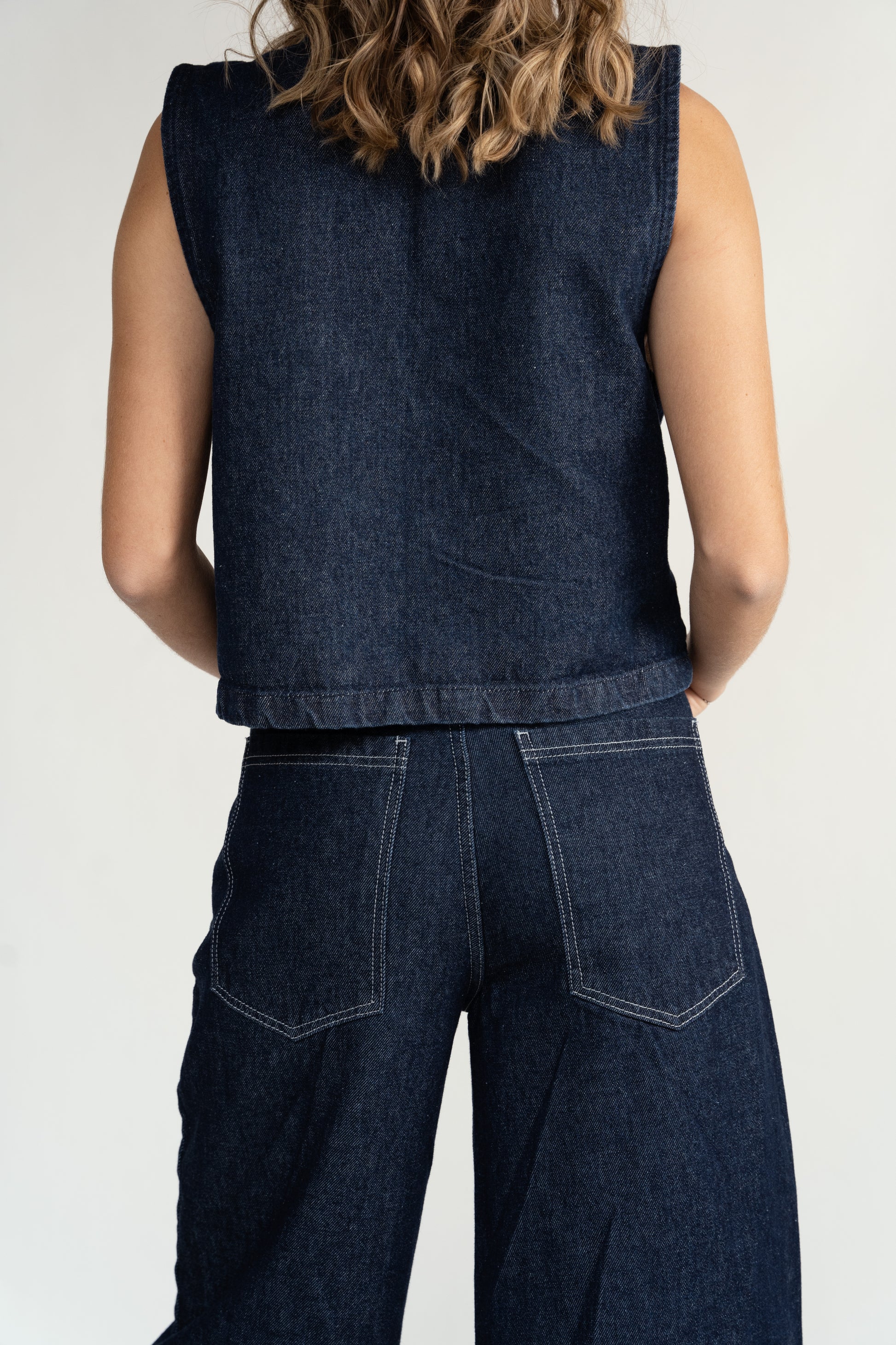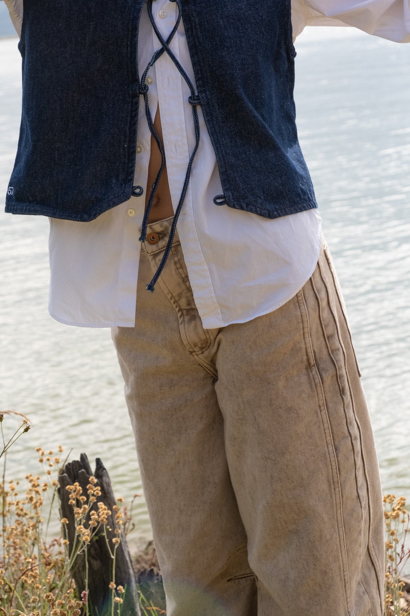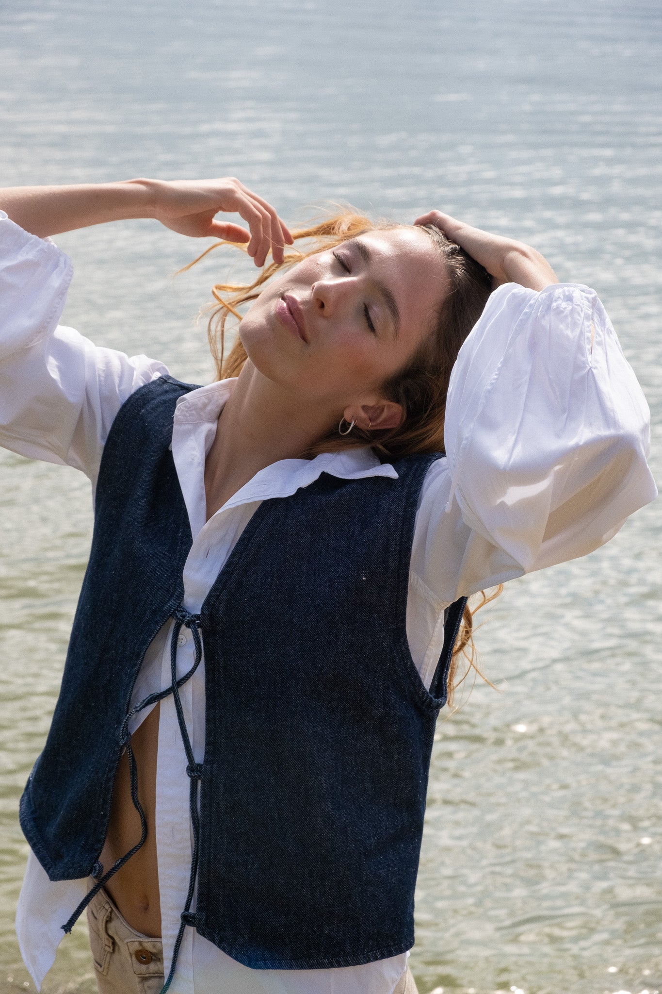 A must-have staple that reinterprets the versatility of denim. This vest, made from 100% organic cotton, is the piece that elevates any look. Its minimalist design with adjustable tie details provides a fresh and functional touch, allowing you to wear it open or closed to suit your mood.