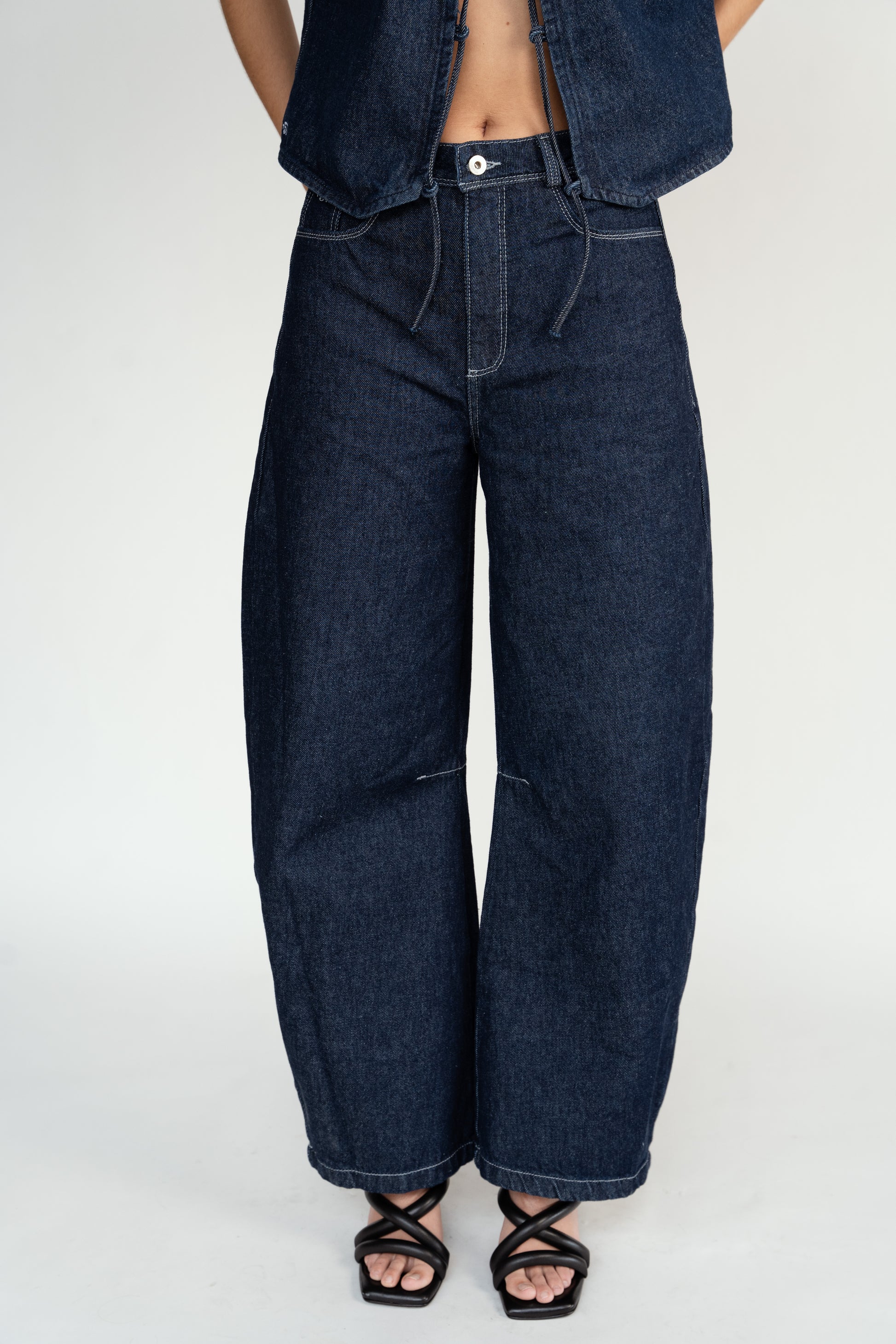 These dark blue denim pants are the perfect basic that combines versatility and style. Their wide-leg design and high waist create a modern and flattering fit that suits any occasion. Classic details like back pockets and visible seams enhance their minimalist aesthetic, while their high-quality 100% cotton denim construction ensures comfort and durability.