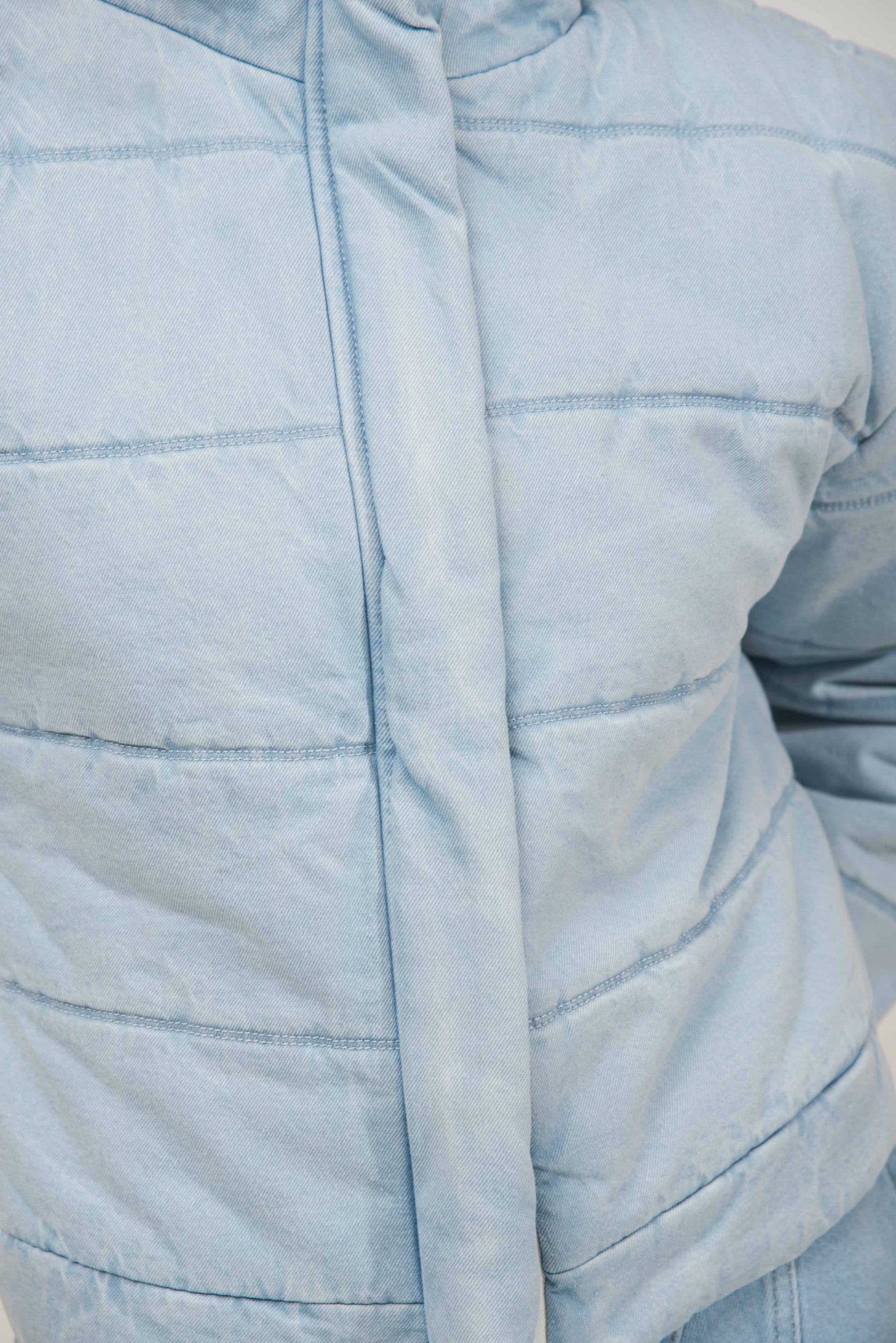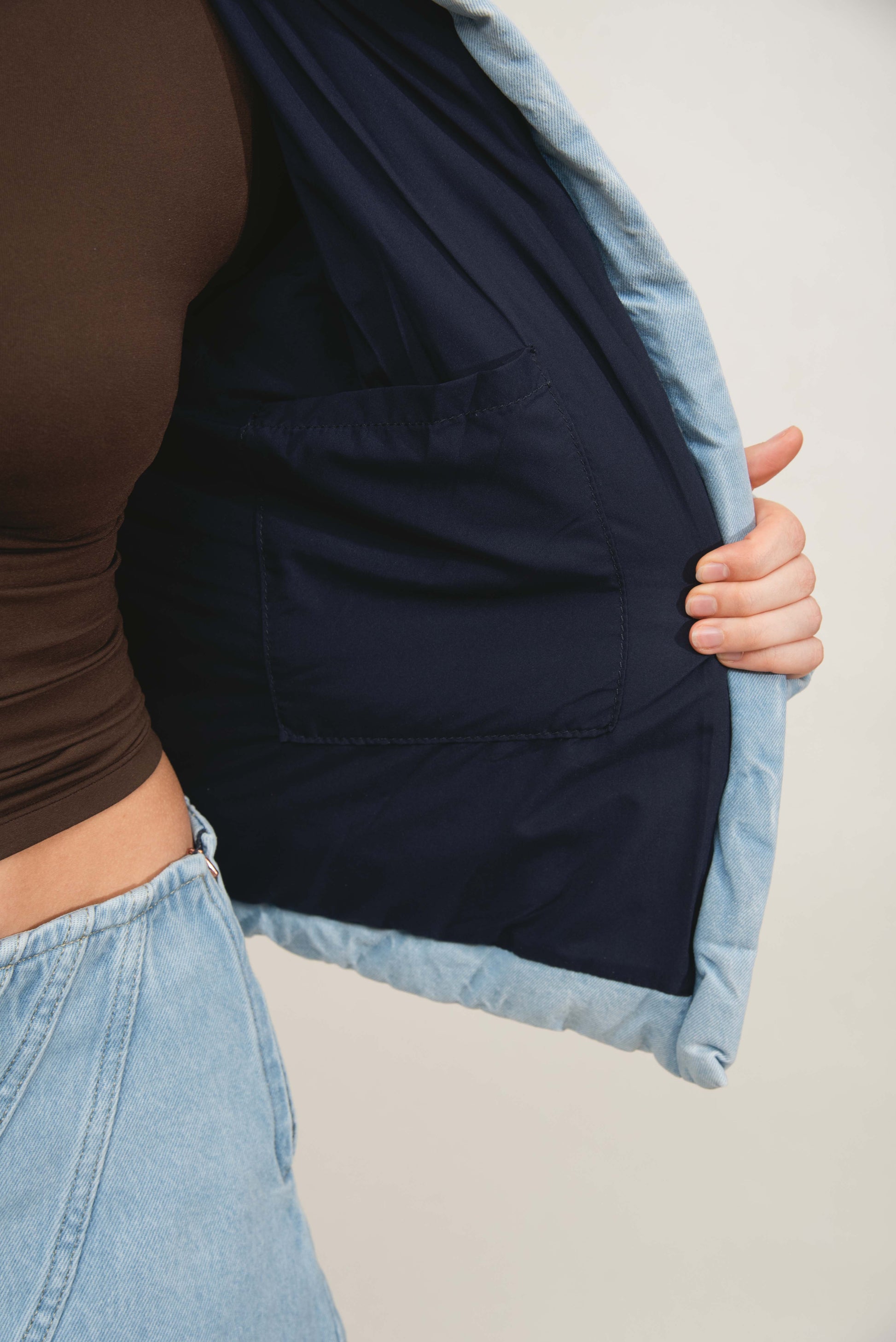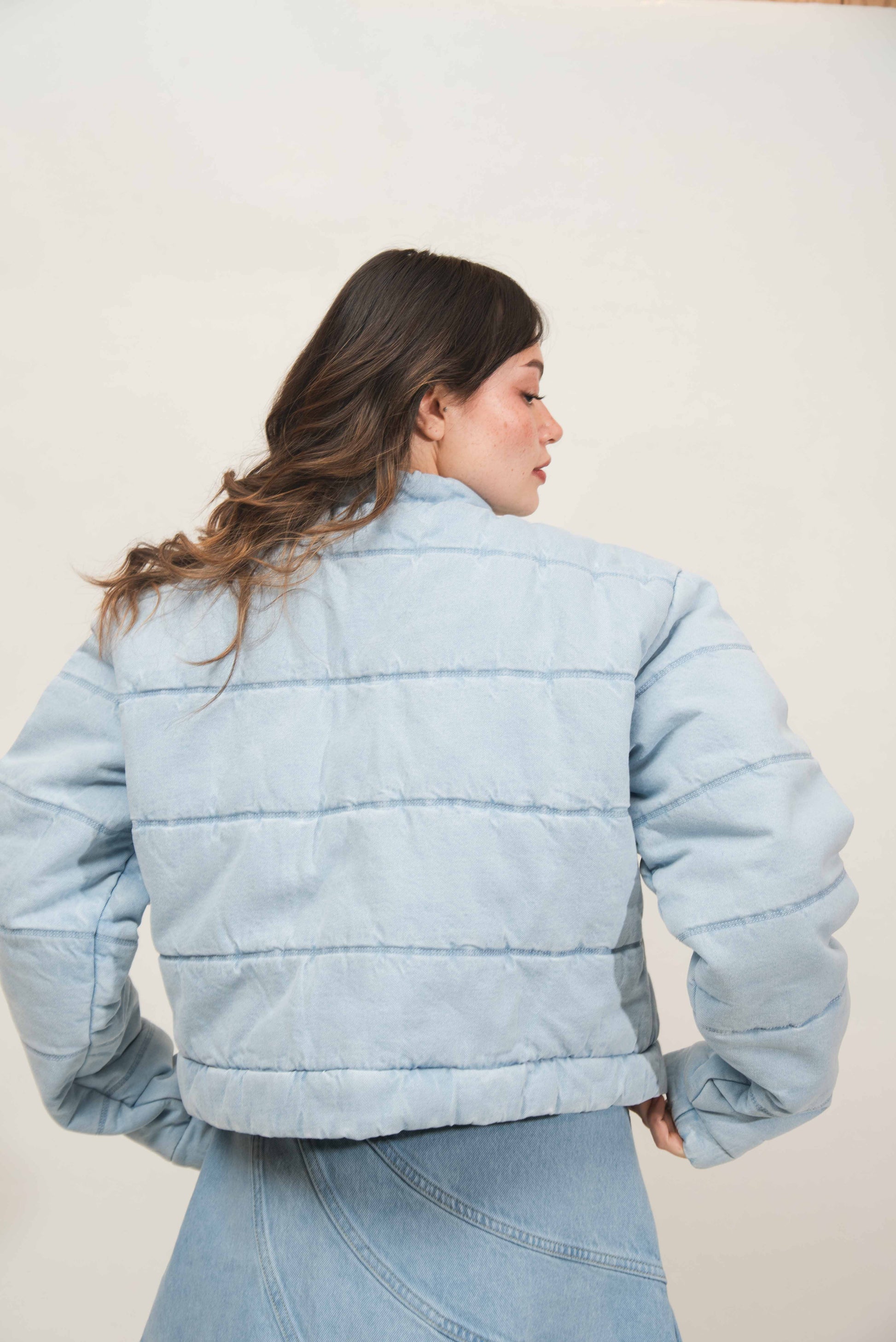 Una puffer ligera reinterpretada en denim suave, con un volumen estructurado y limpio. Su acolchado crea una silueta pura y contemporánea. Un diseño pensado para quienes buscan abrigo con carácter y estética minimal.
