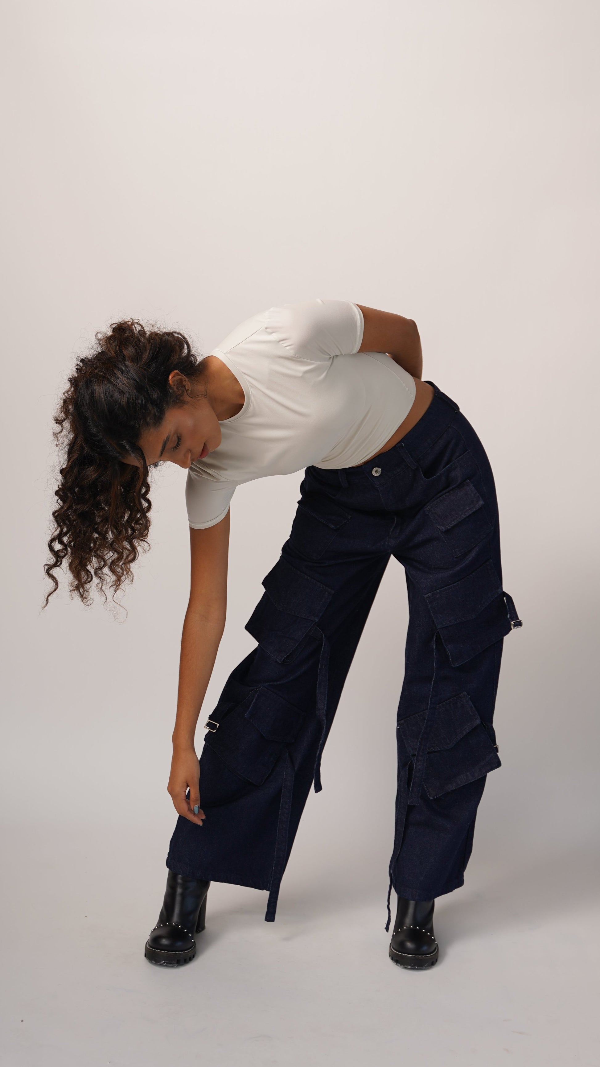 Este pantalón cargo en denim oscuro es pura versatilidad y estilo. Con múltiples bolsillos laterales y tiras ajustables, mezcla lo utilitario con un toque moderno. Perfecto para quienes buscan un look relajado pero lleno de carácter al estilo +57.