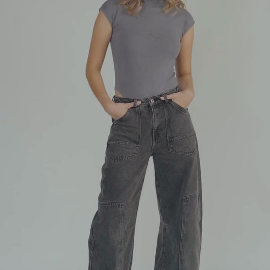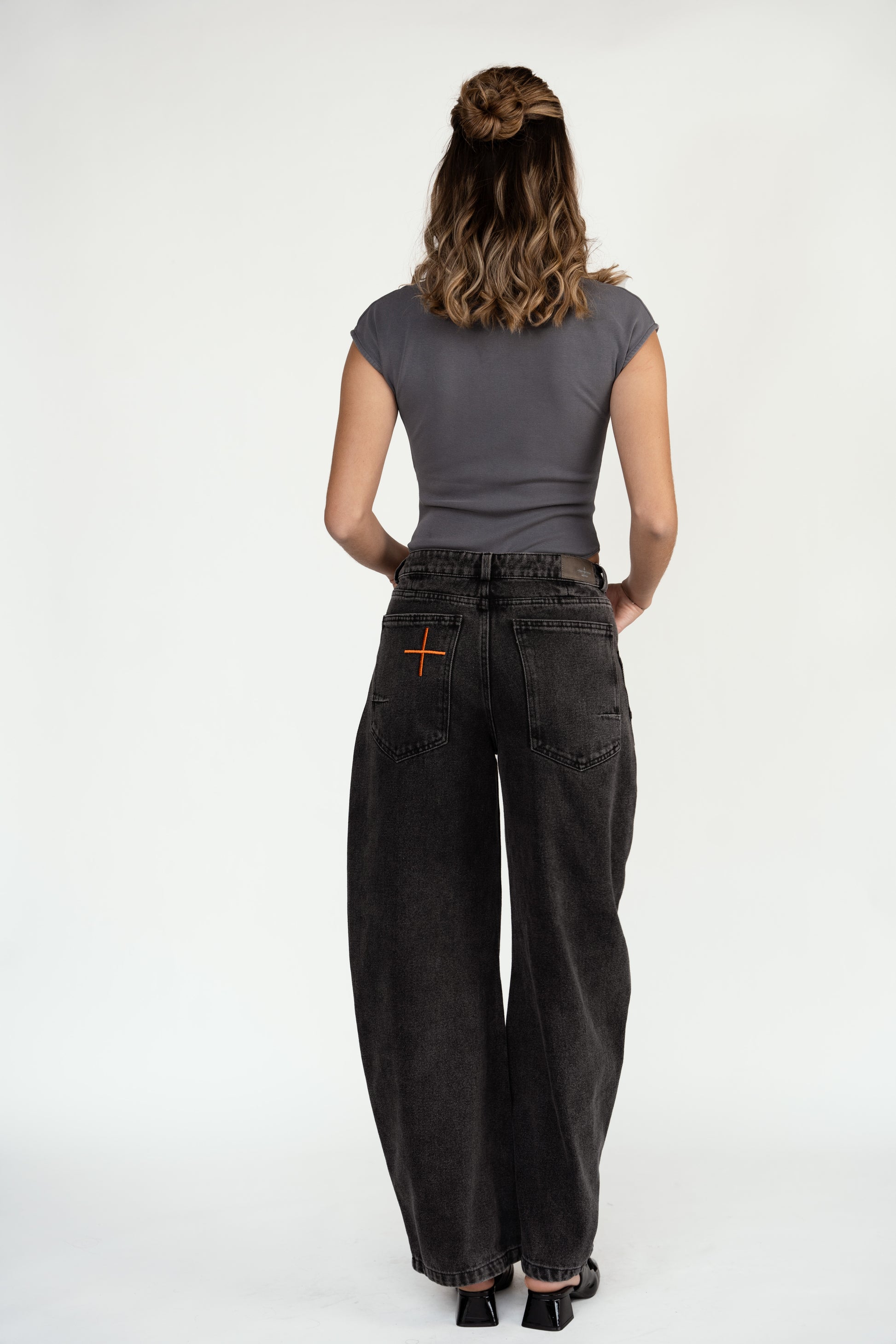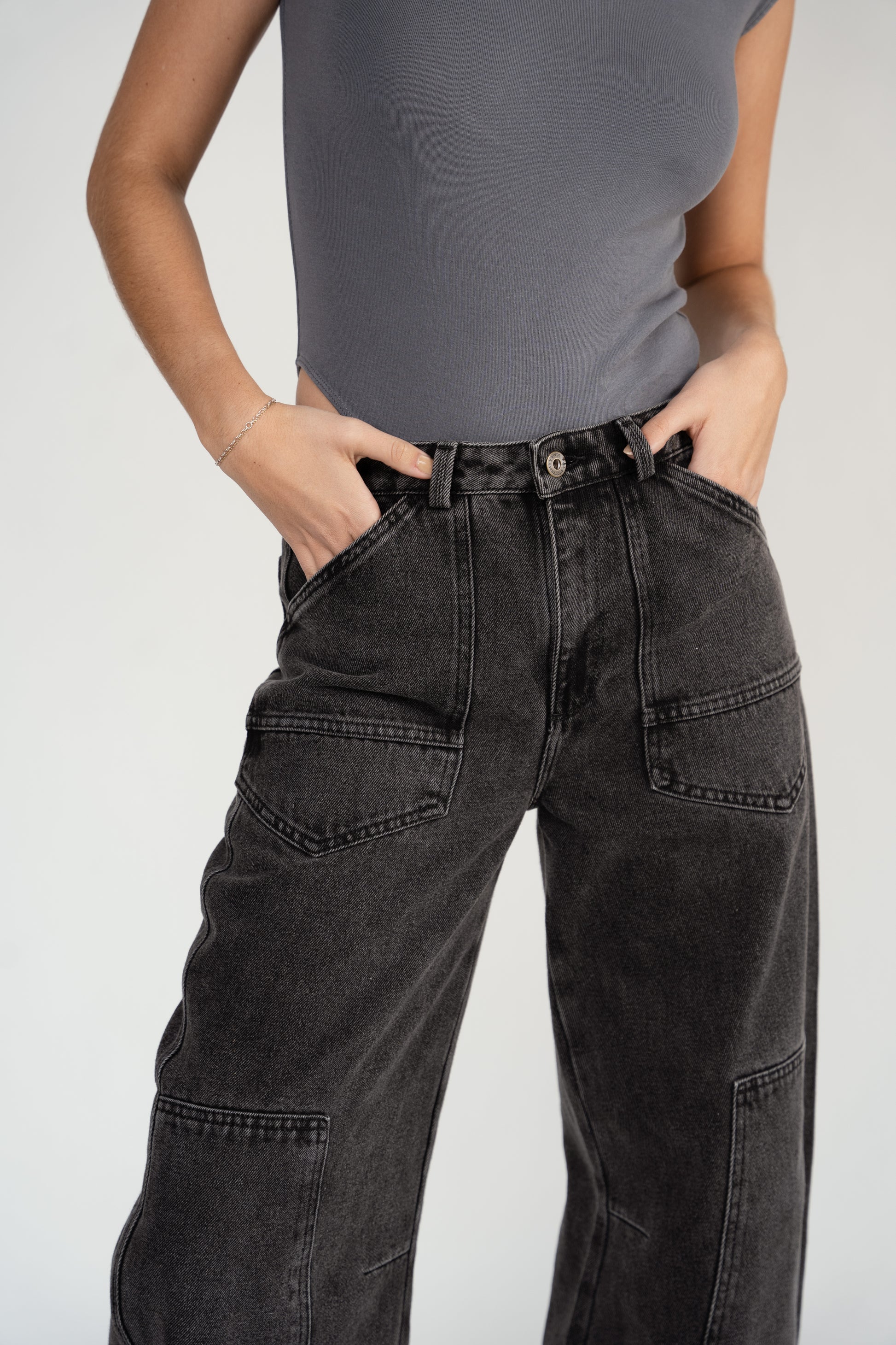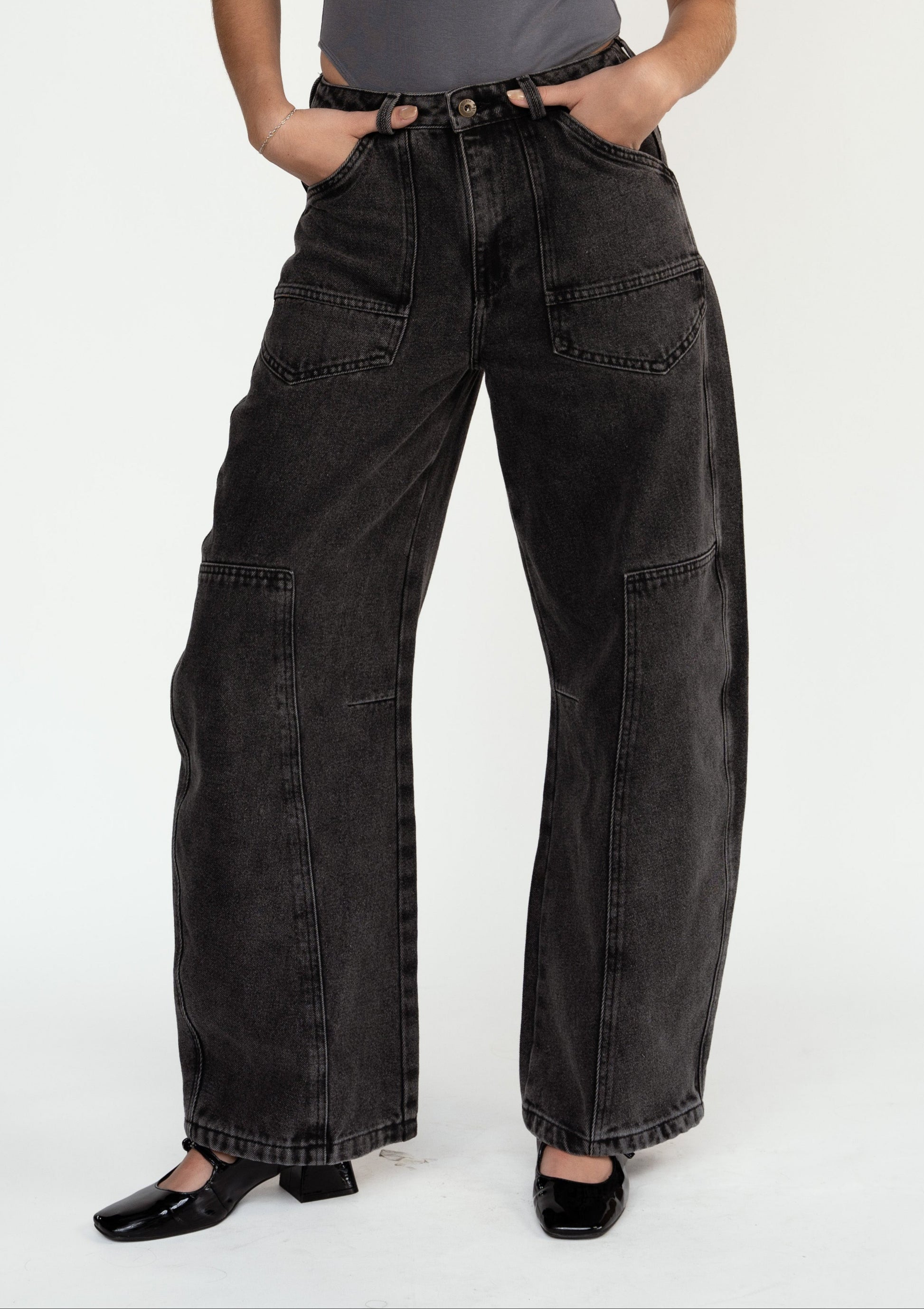 Este pantalón en denim negro con un acabado de efecto lavado redefine lo utilitario con un toque moderno. Las costuras marcadas y el icónico bordado en contraste en la parte trasera le dan un carácter único que no pasa desapercibido. Su silueta de pierna ancha y detalles funcionales, como bolsillos frontales y traseros, lo convierten en una pieza práctica pero con actitud.