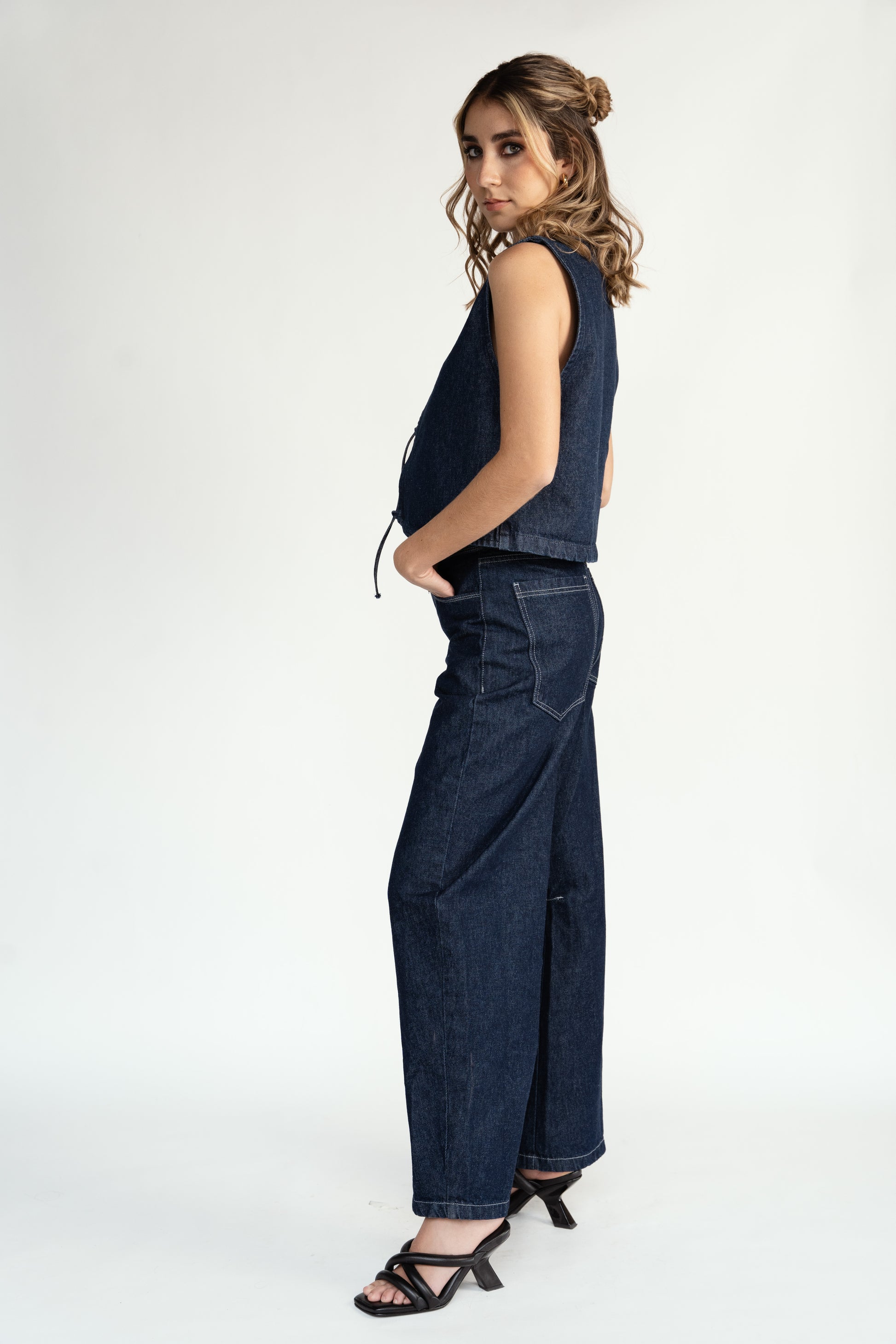 Este pantalón de denim azul oscuro es el básico perfecto que combina versatilidad y estilo. Su diseño de pierna ancha y cintura alta crea un fit moderno y favorecedor que se adapta a cualquier ocasión. Los detalles clásicos como los bolsillos traseros y las costuras visibles realzan su estética minimalista, mientras que su confección en denim 100% algodón de alta calidad asegura comodidad y durabilidad.
